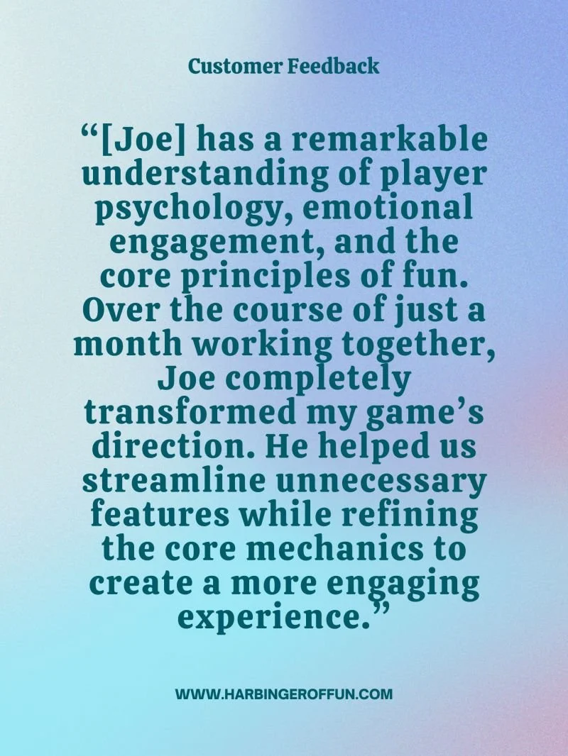 Most commonly people are looking for a solution to an experience that doesn’t feel exciting, fun, or engaging. I have identified and defined what makes a product truly fun, and I will show you exactly what you need to add, remove or refine, no matter what product you have, to serve the psychological needs of the audience, and make it truly memorable and fun.